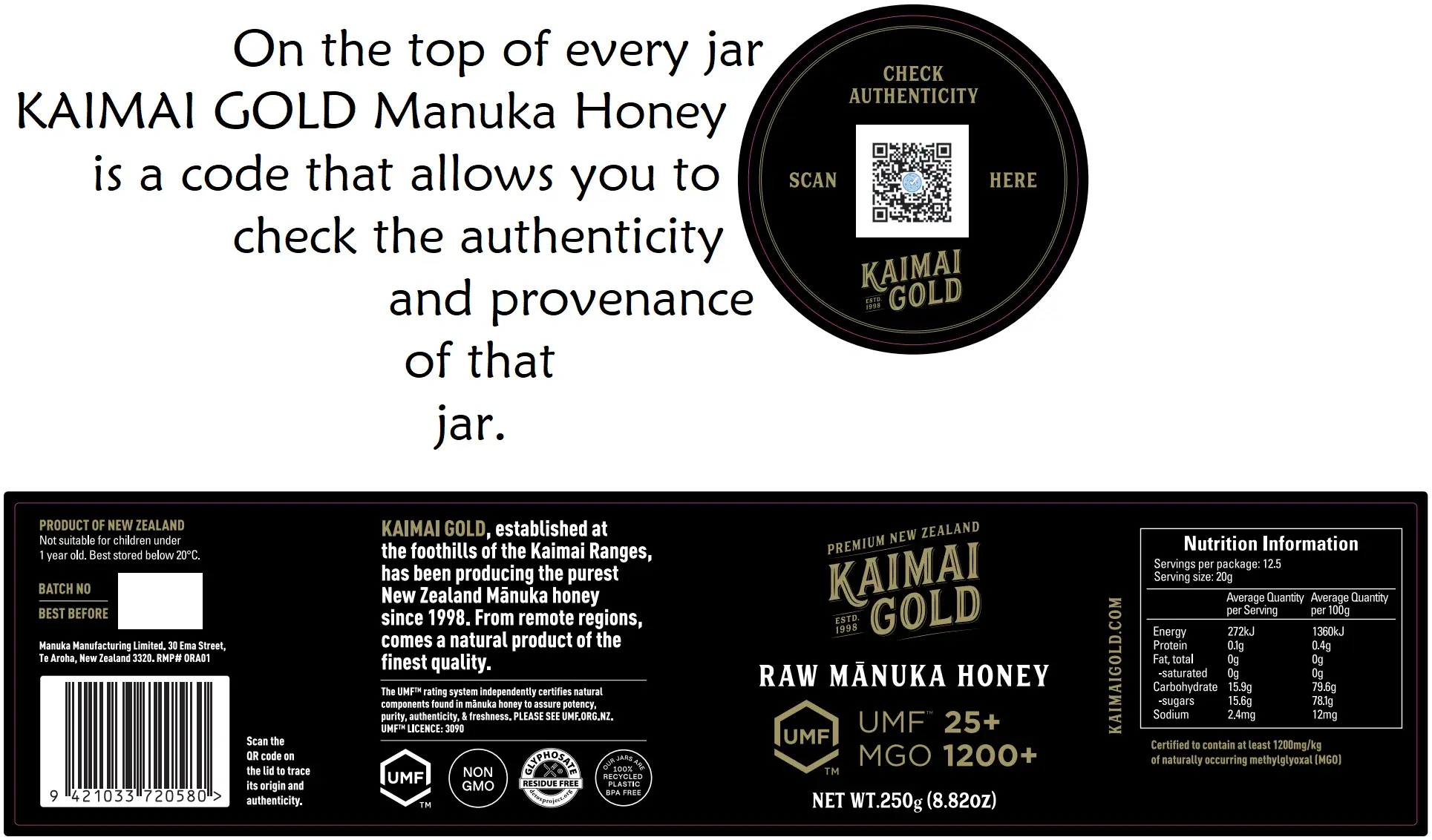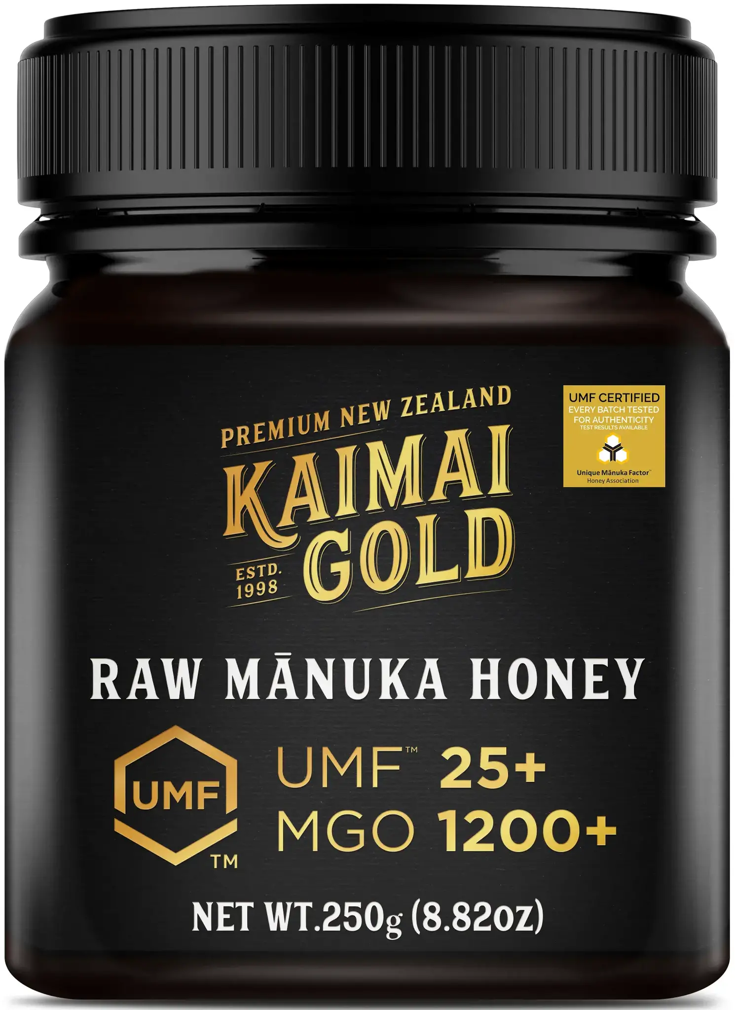 Kaimai Gold UMF® 25+ (MGO 1200+) ManukaHoning is Premium Monoflorale UMF® Gecertificeerde ManukaHoning uit Nieuw-Zeeland